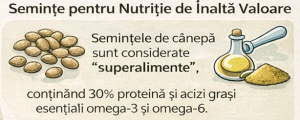 Semințele de cânepă sunt recunoscute ca superalimente datorită profilului lor nutrițional excepțional. Ele conțin aproximativ 30% proteină și sunt bogate în acizi grași esențiali omega-3 și omega-6, fiind o sursă importantă de nutriție pentru alimentația modernă.