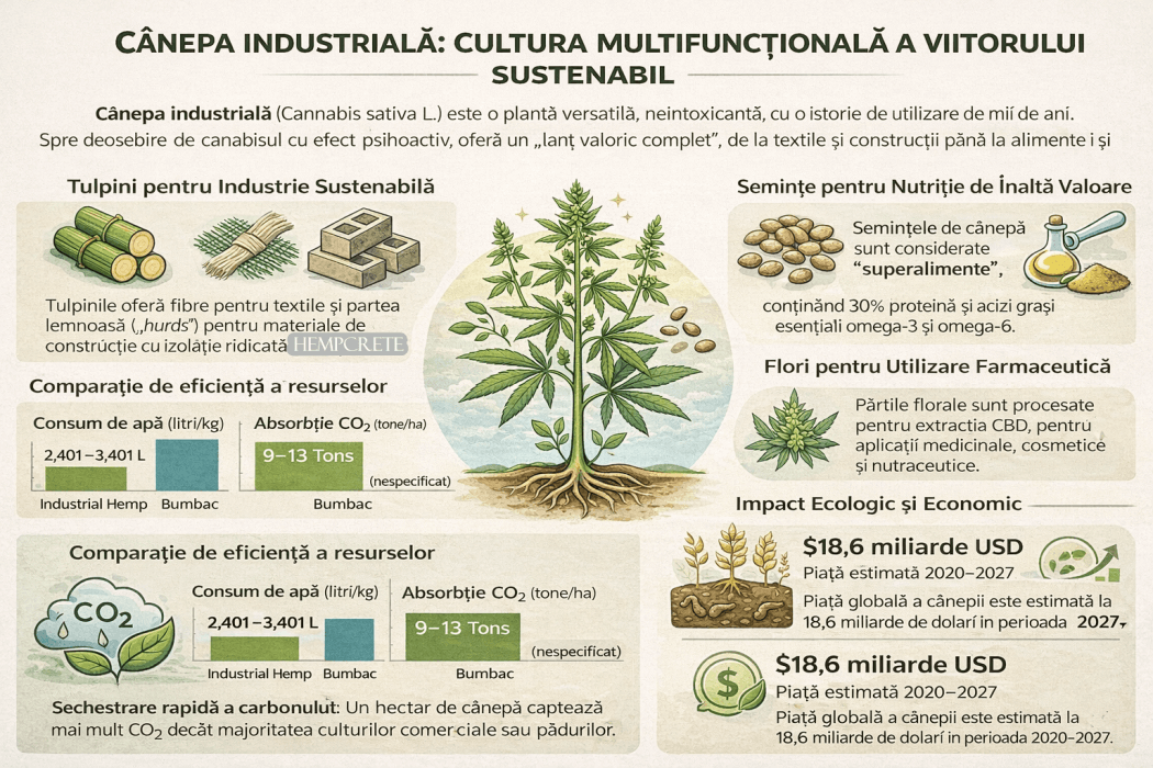 Cânepa industrială (Cannabis sativa L.) reprezintă una dintre cele mai vechi plante cultivate de omenire, cu o istorie de mii de ani. Spre deosebire de canabisul cu efect psihoactiv, cânepa industrială conține niveluri foarte scăzute de THC și este apreciată pentru valoarea sa economică și ecologică. Este o plantă „whole-plant”, adică fiecare componentă a sa […]